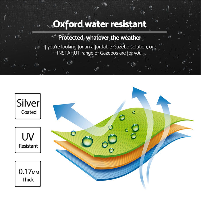 Featuring high density, long lasting silver-coated oxford fabric with effective UV and water repellent treatments, this INSTAHUT 3X3 Pop Up Gazebo provides a lovely ground and canopy coverage of 300 x 300cm. It is perfect for all your upcoming outdoor activities, as a sunshade station as well as a shelter for unexpected rains.
