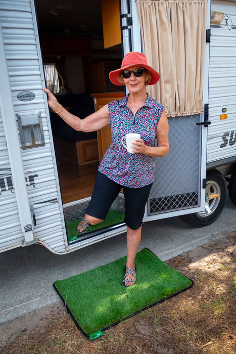 The muk mat caravan step mat is specifically designed to fit on the inner step of your caravan so you can wipe the muk straight from your feet before hopping inside.