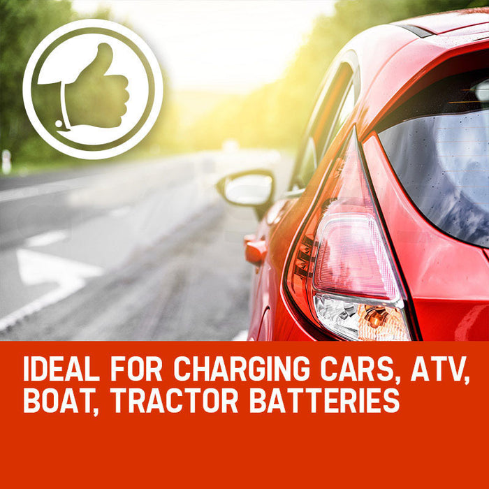 Suitable for lead-acid batteries, with built in protection for accidental reverse polarity and a fast/slow charge setting for safe reliable charging.