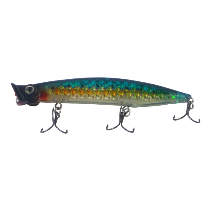Toppu Mizzu Cupface Poppers have a 110mm long body and come equipped with Size #6 Black Nickel Treble Hook. The body of the lure has a high quality finish that has excellent light reflecting properties to attract attention.